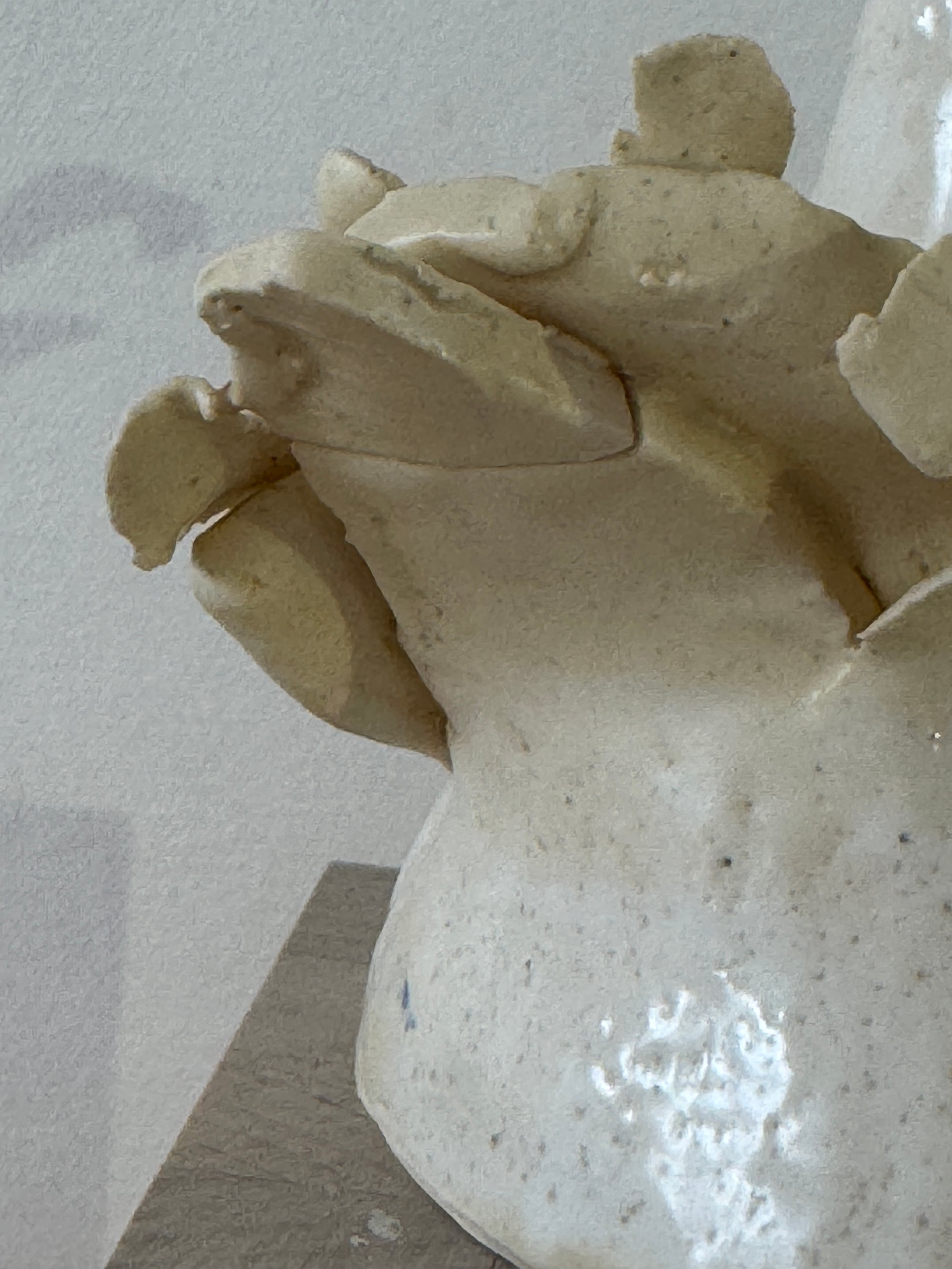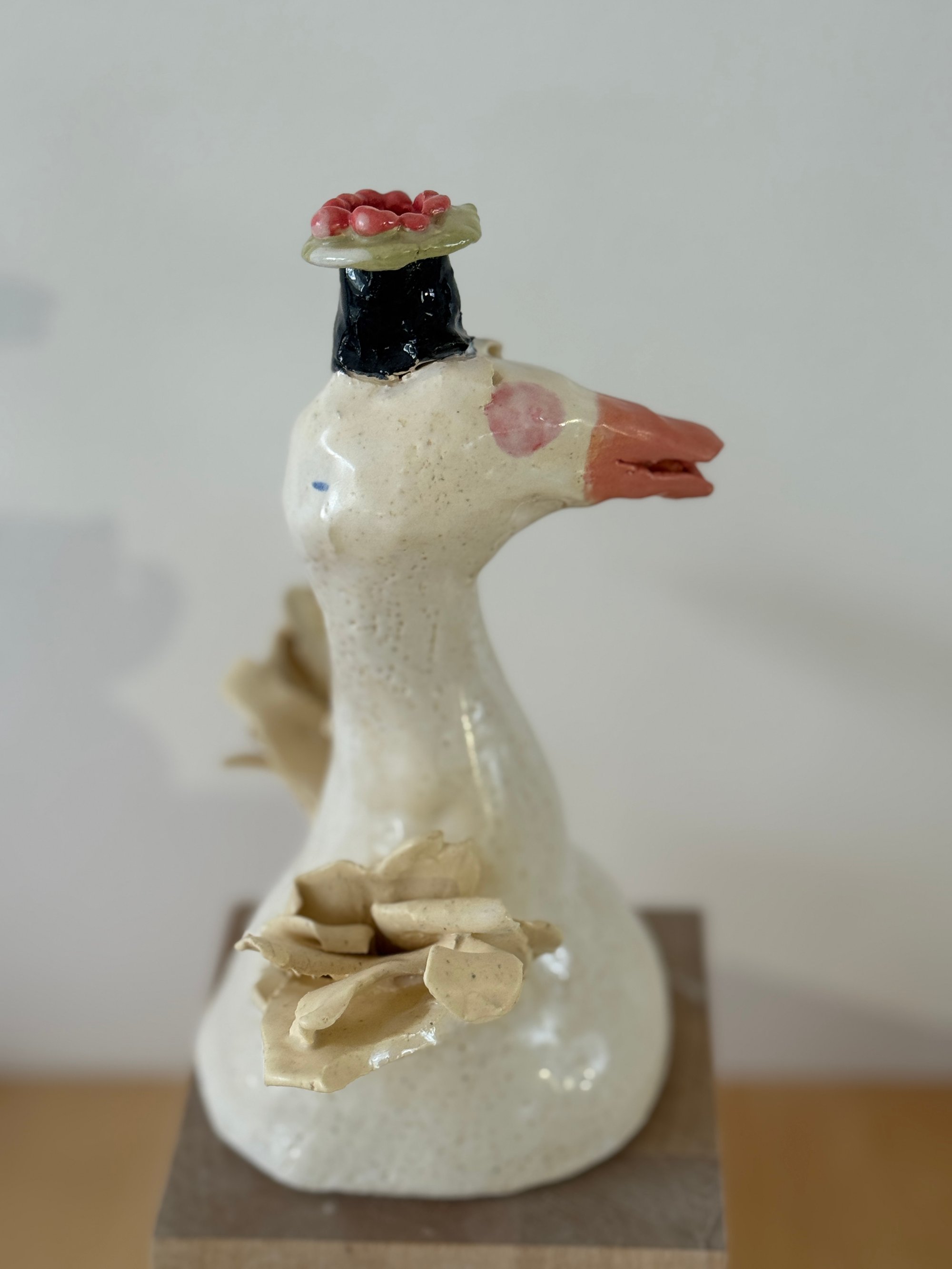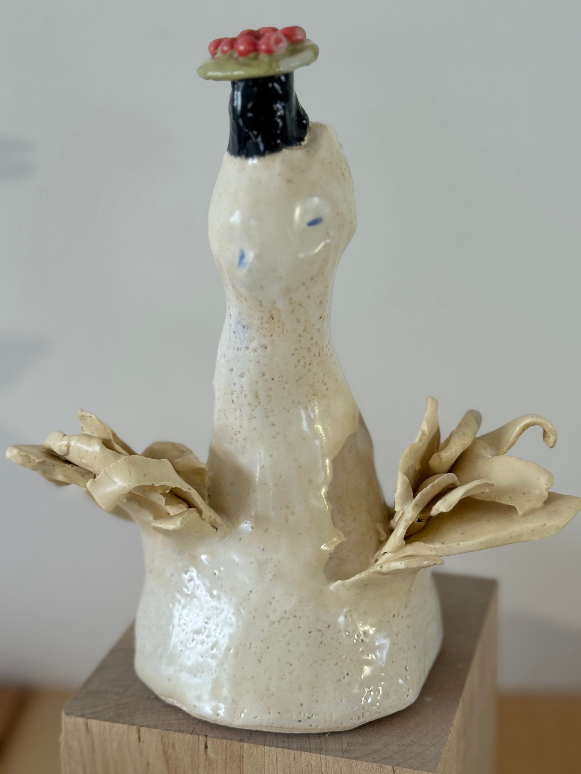 About 8" high, suitable for a cake topper, or standalone on table. Stoneware clay. FYI The wings are made with bits of clay, one piece was refired for security but is fine..