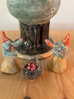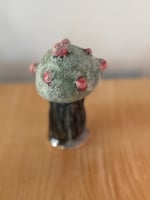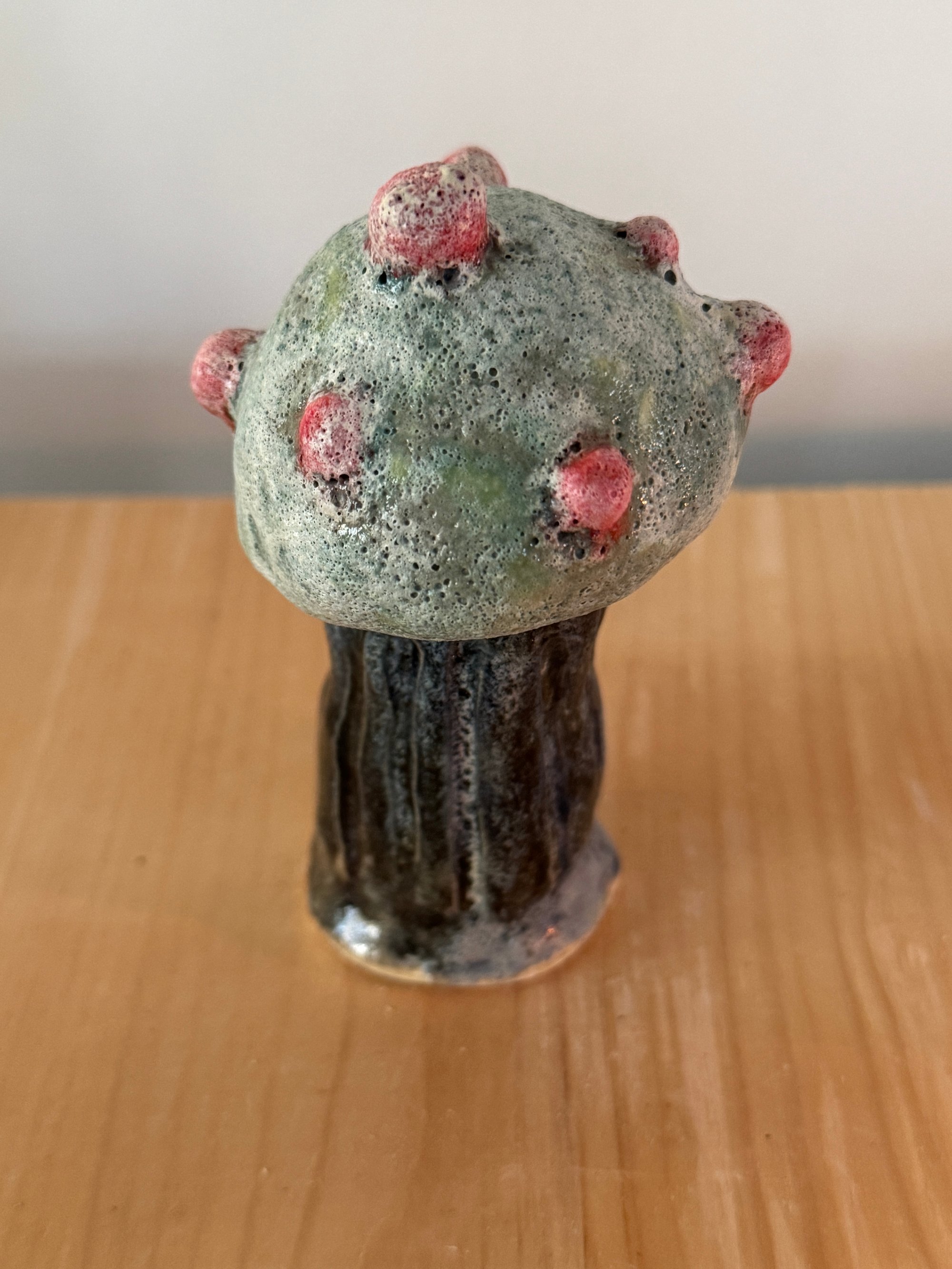 Tallest tree is about 5". stoneware, multi glazed for stone like effect. We have very old apple trees all over the farm and they are all misfit and some lean and wobble but i love them all.
