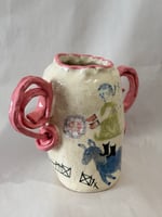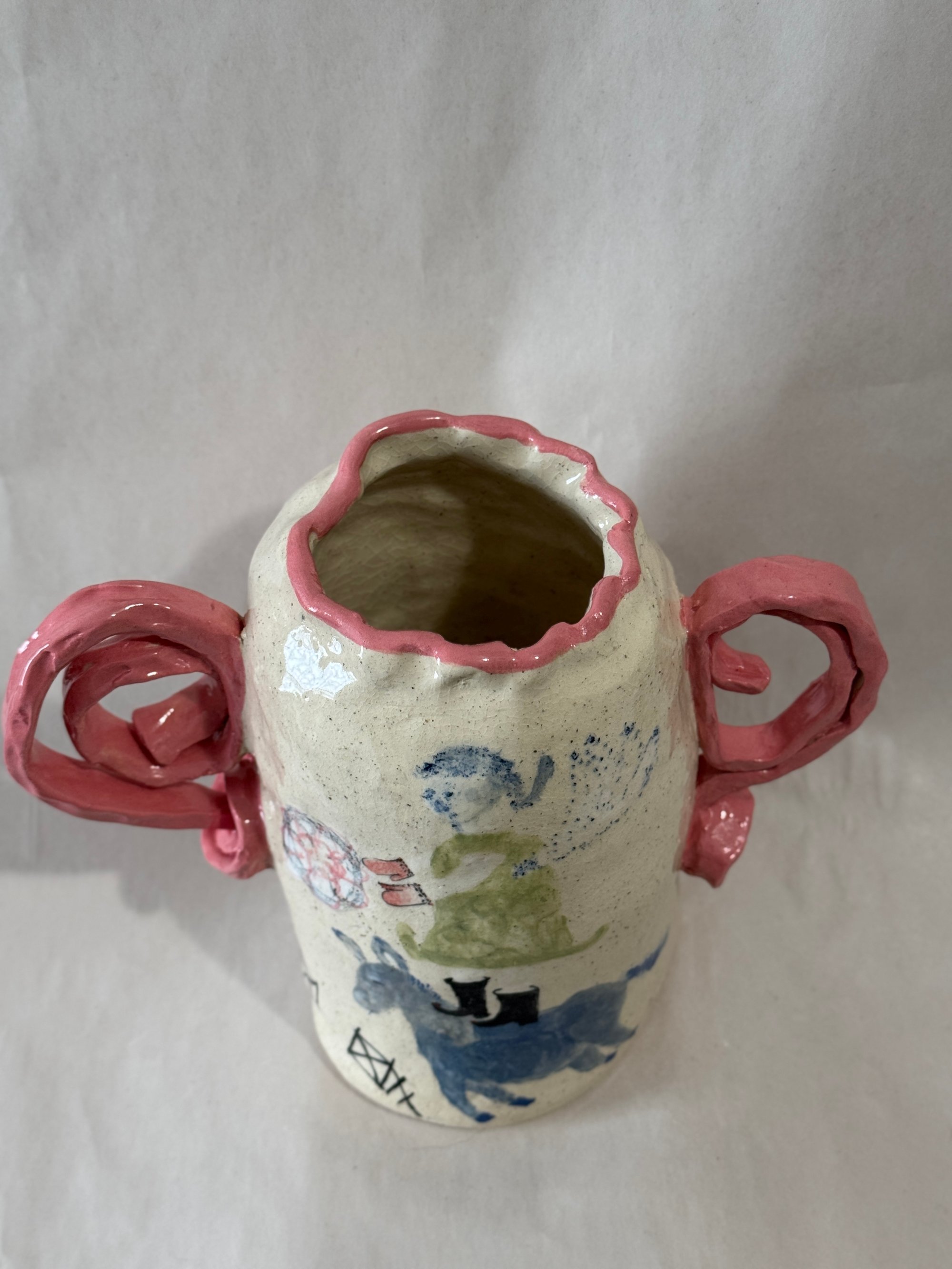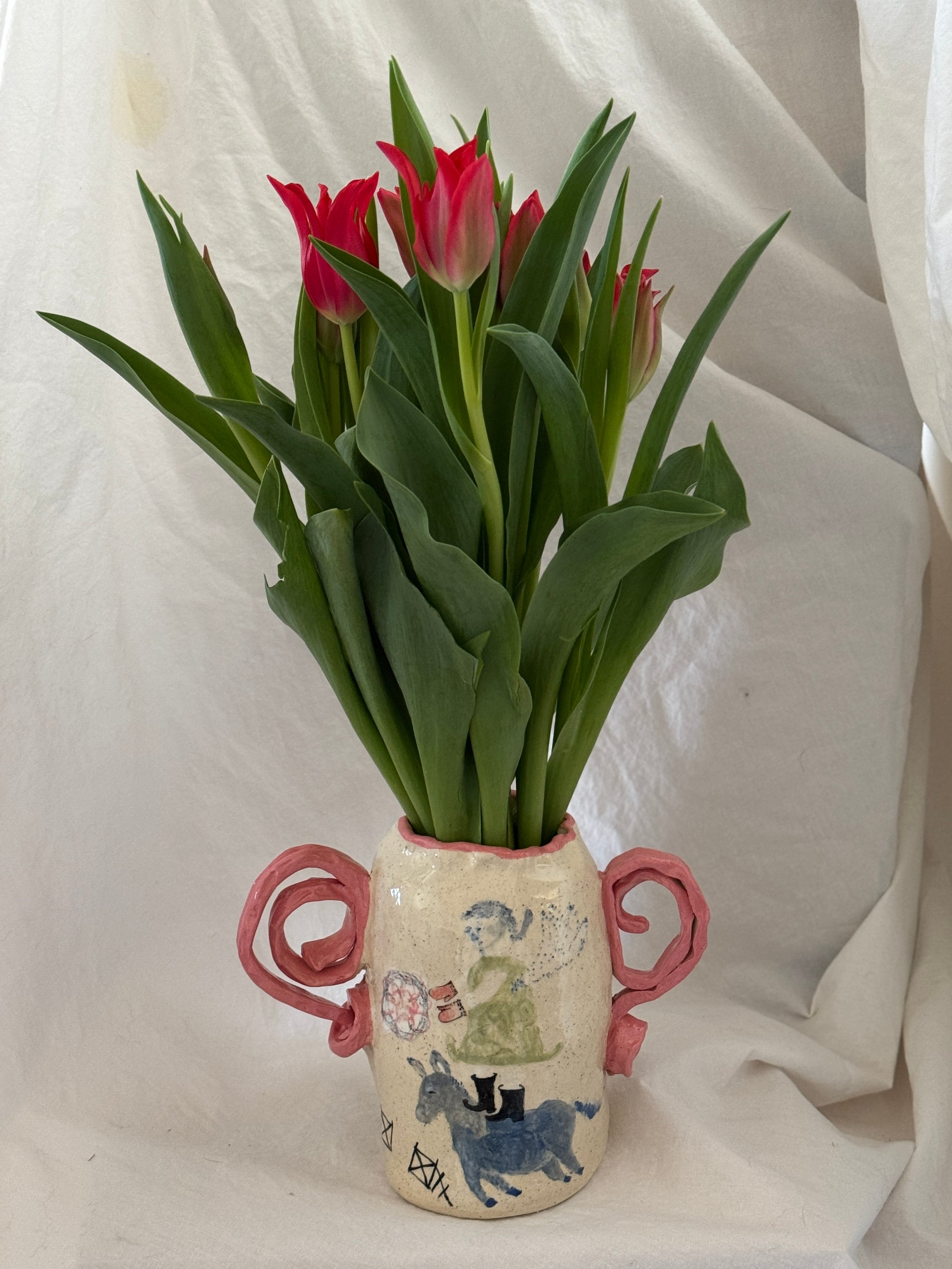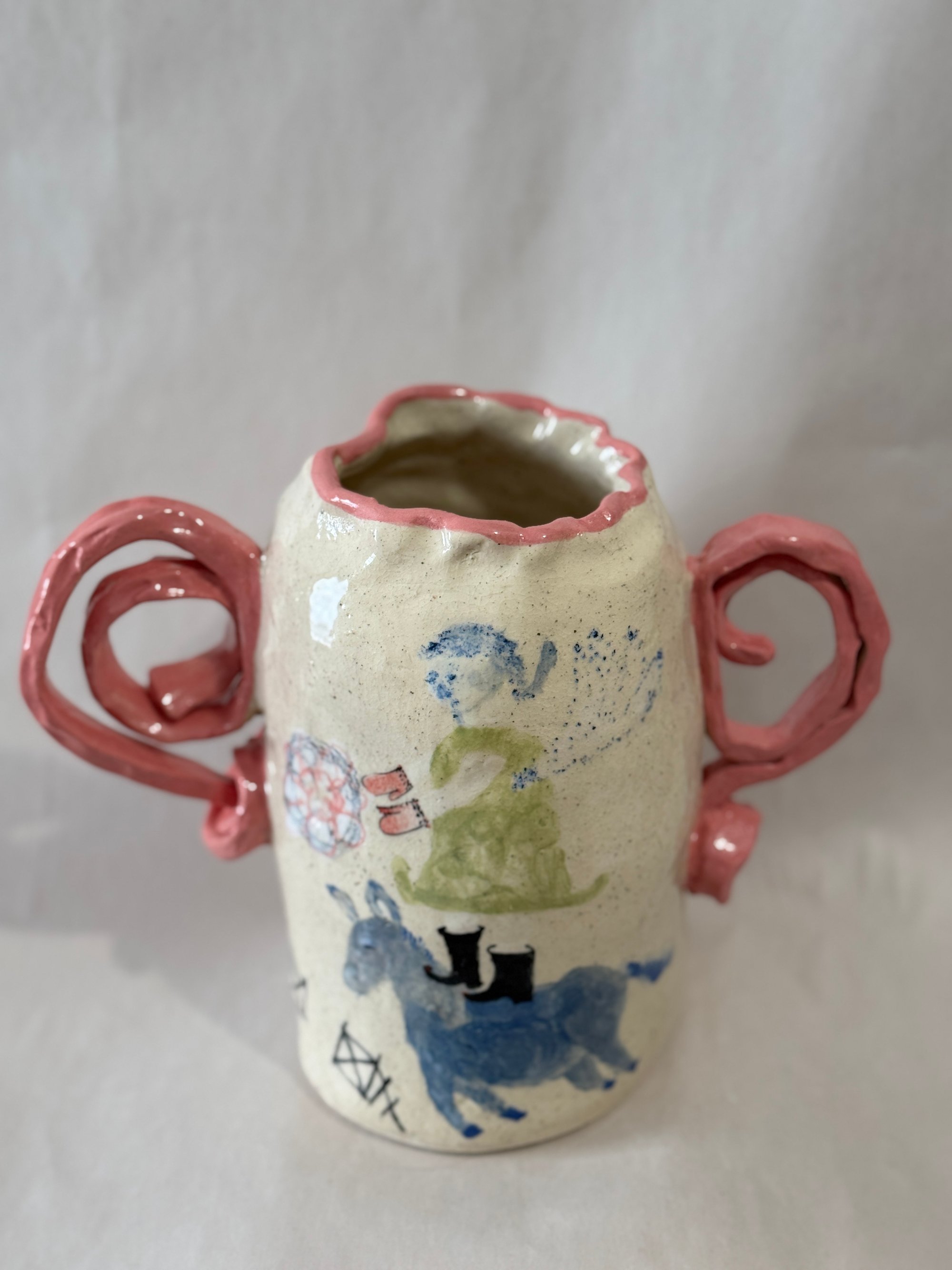 Girl and donkey floating over the land. Stoneware. Hand built and hand painted.