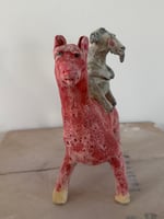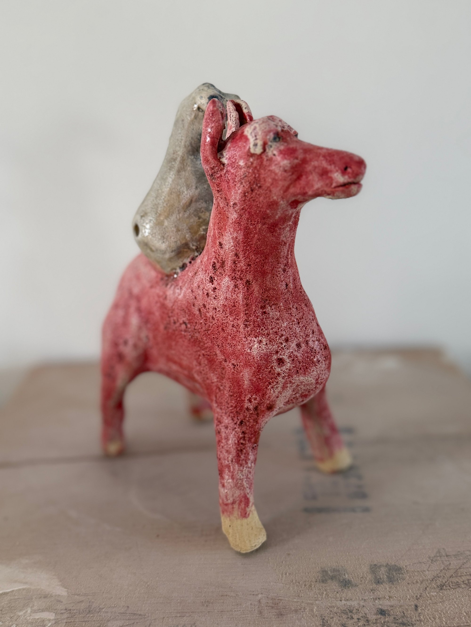 Stoneware, multiple firings to achieve gaze effect. 7" tall, 3" wide. 6" long.