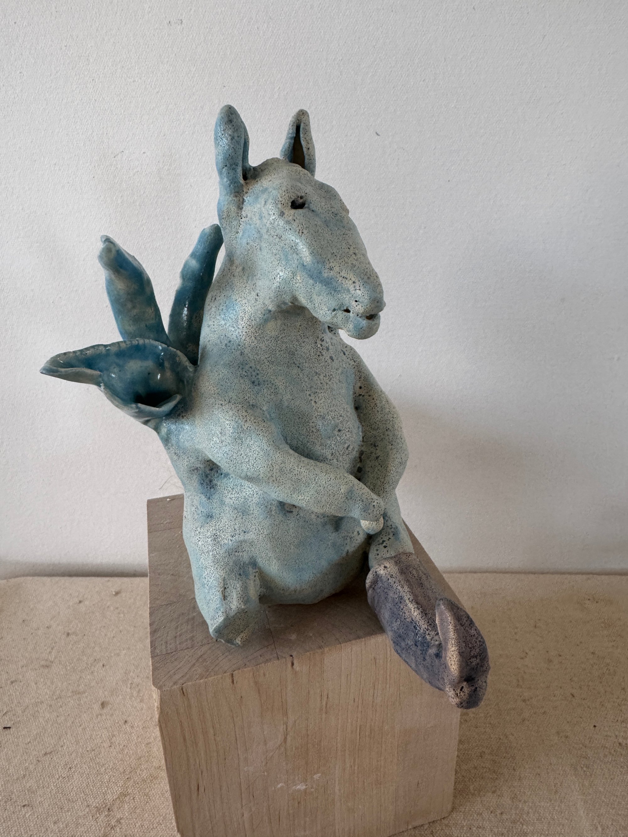 Little Blue Donkey lost his leg in a farming accident. He carried his leg with the boot attached to the rural vet and they tried to help him reattach it, but sadly, could not. But they gave him his boot back so sometimes he just holds his boot for a nice memory of his leg.