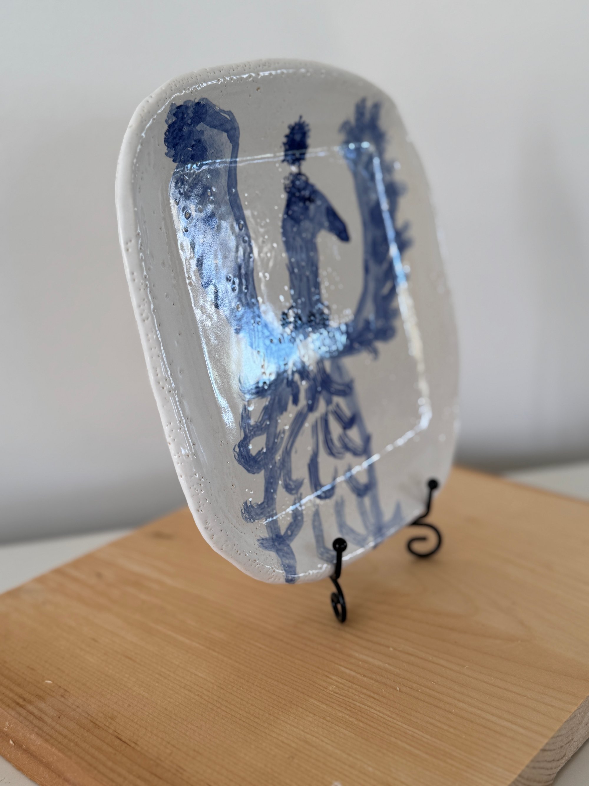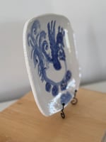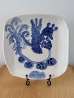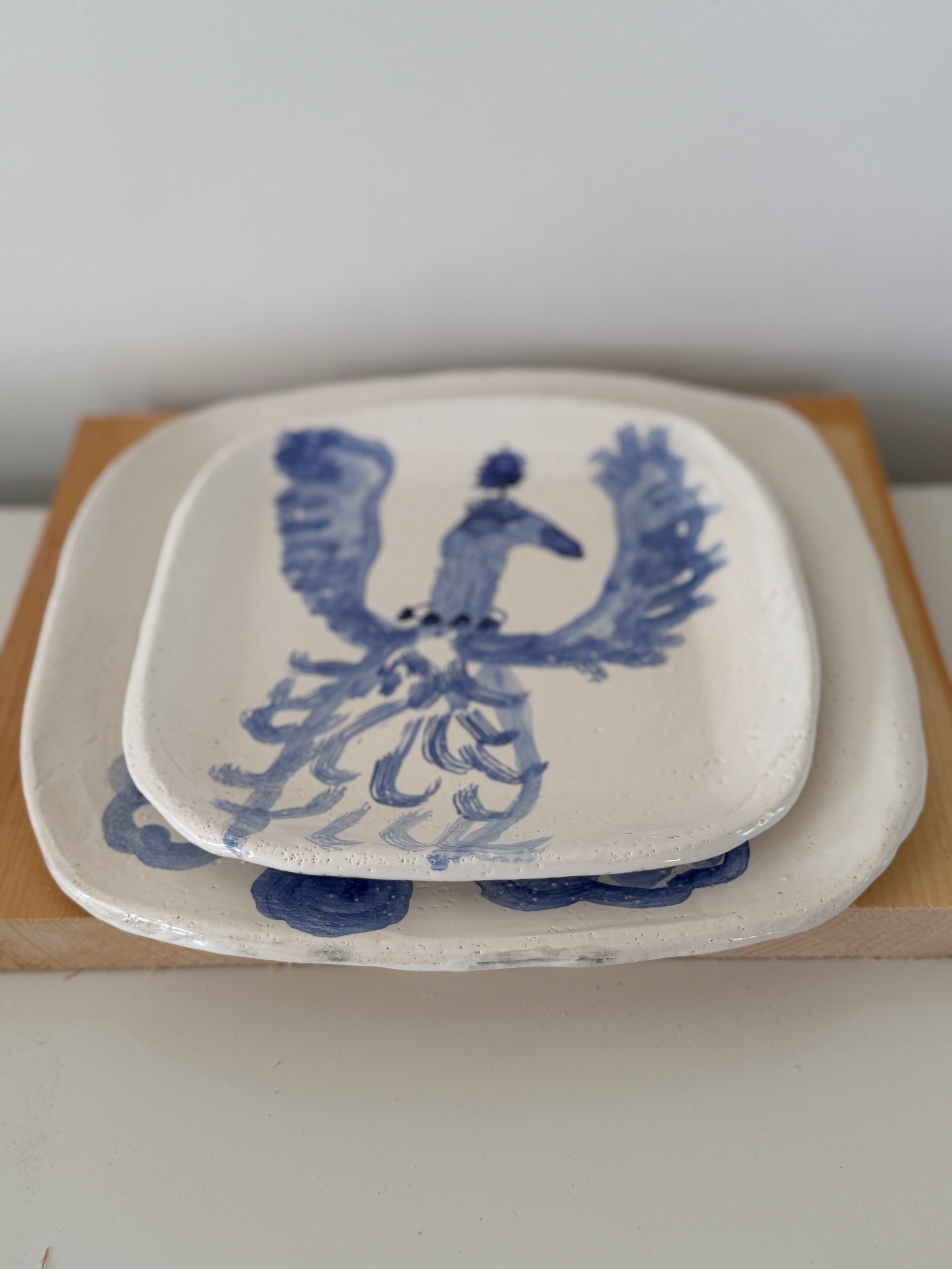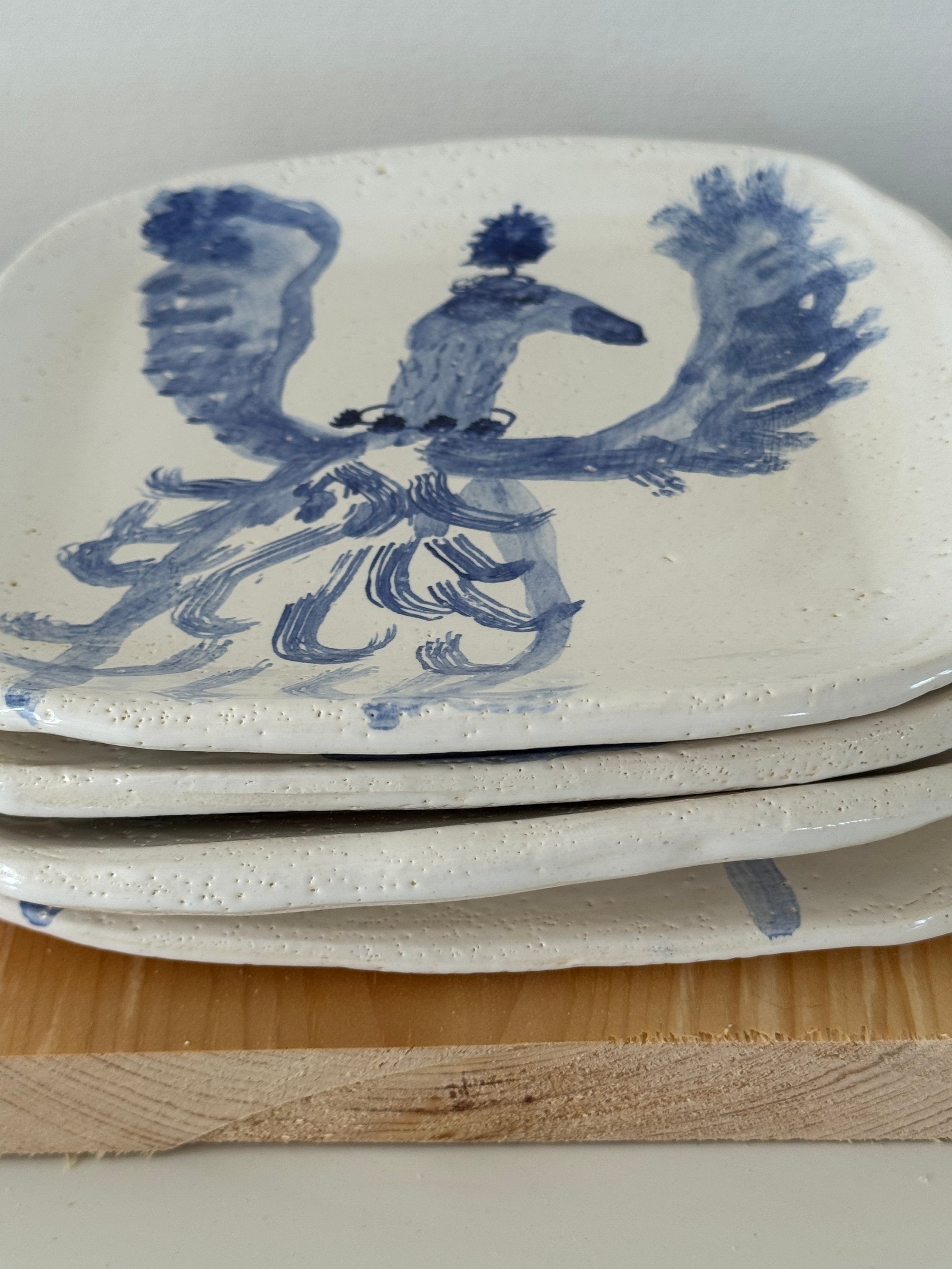 These are handmade stoneware plates, hand built with blue oxide decoration. No two are alike.