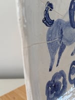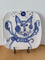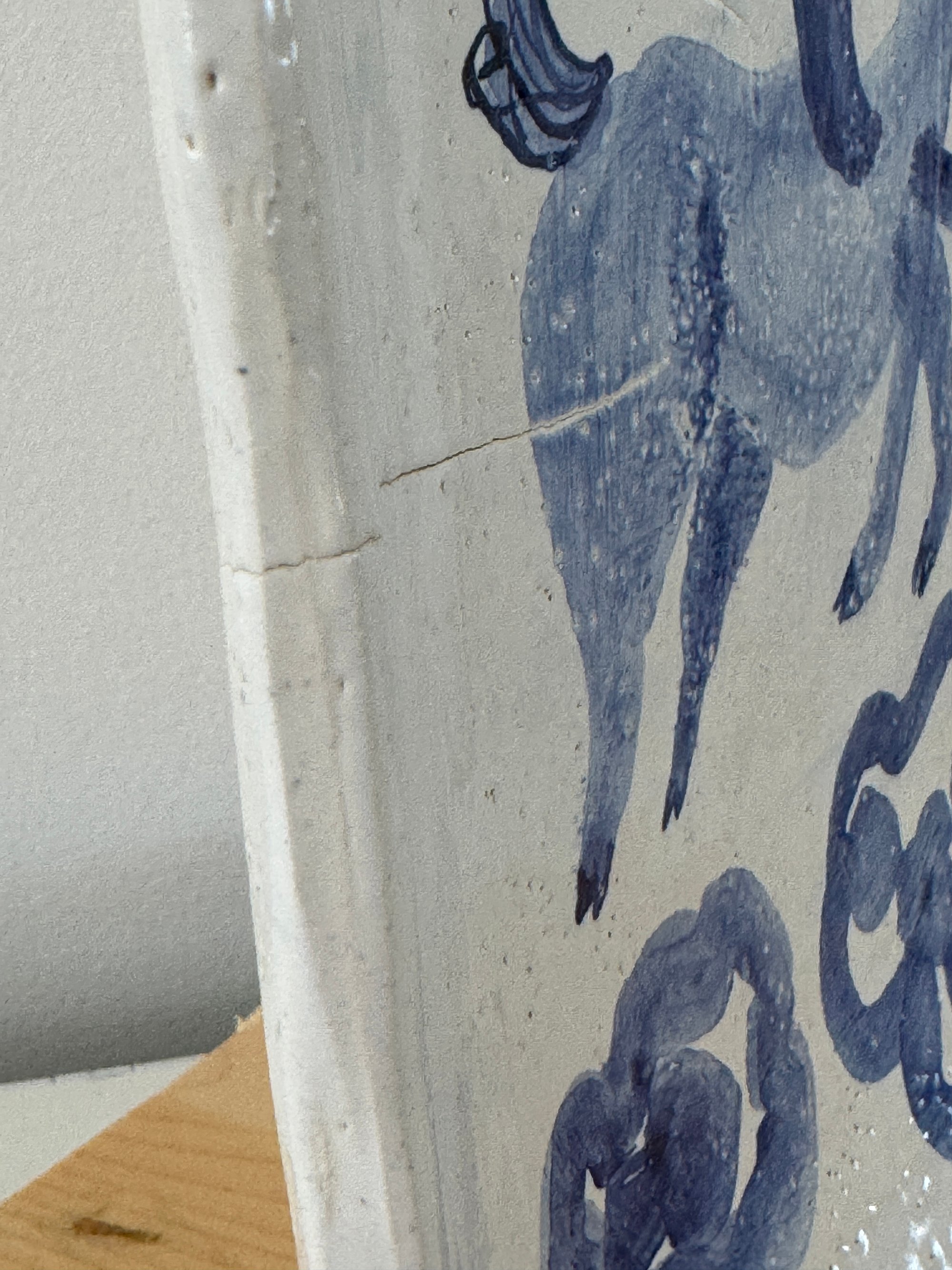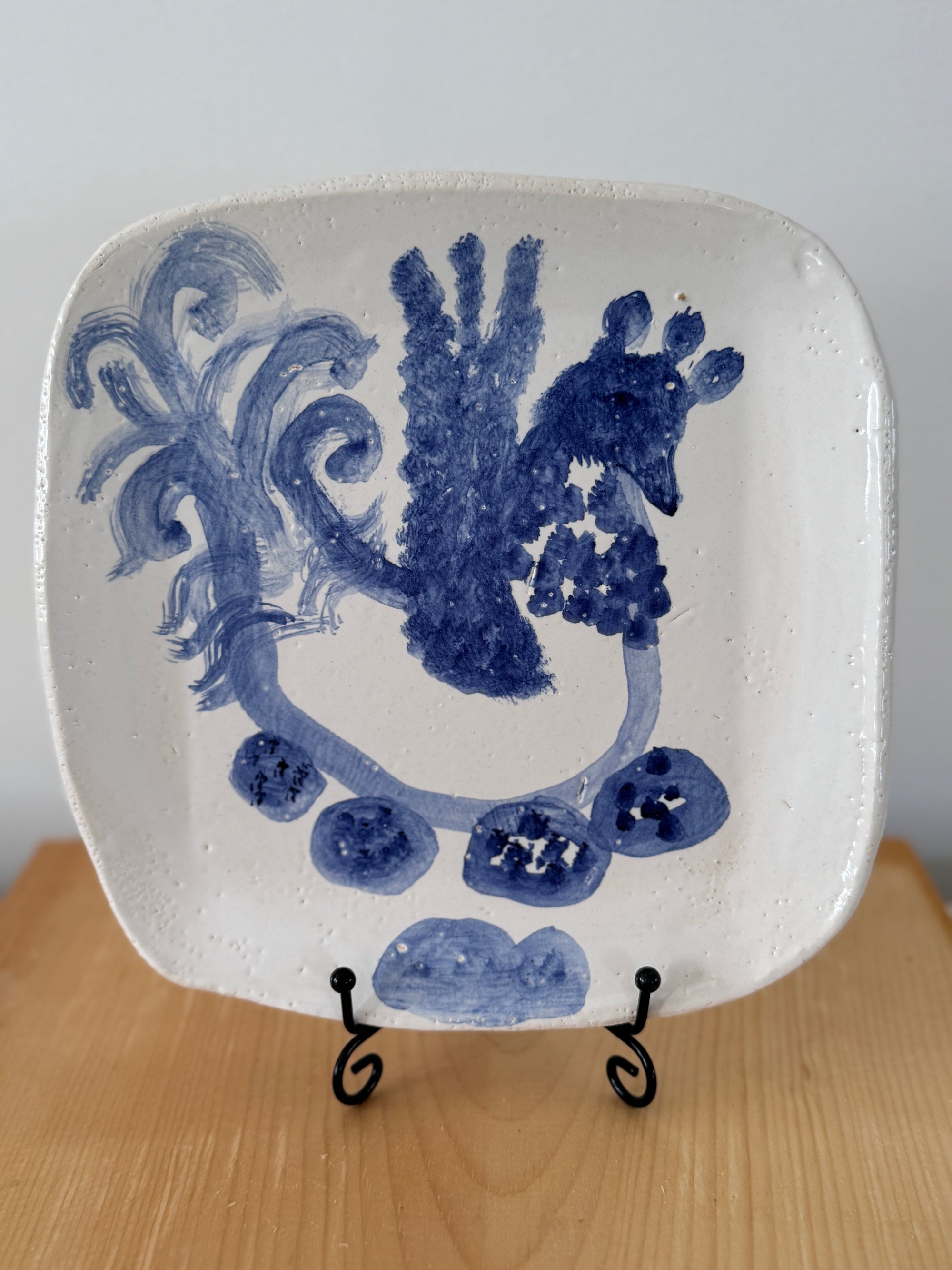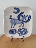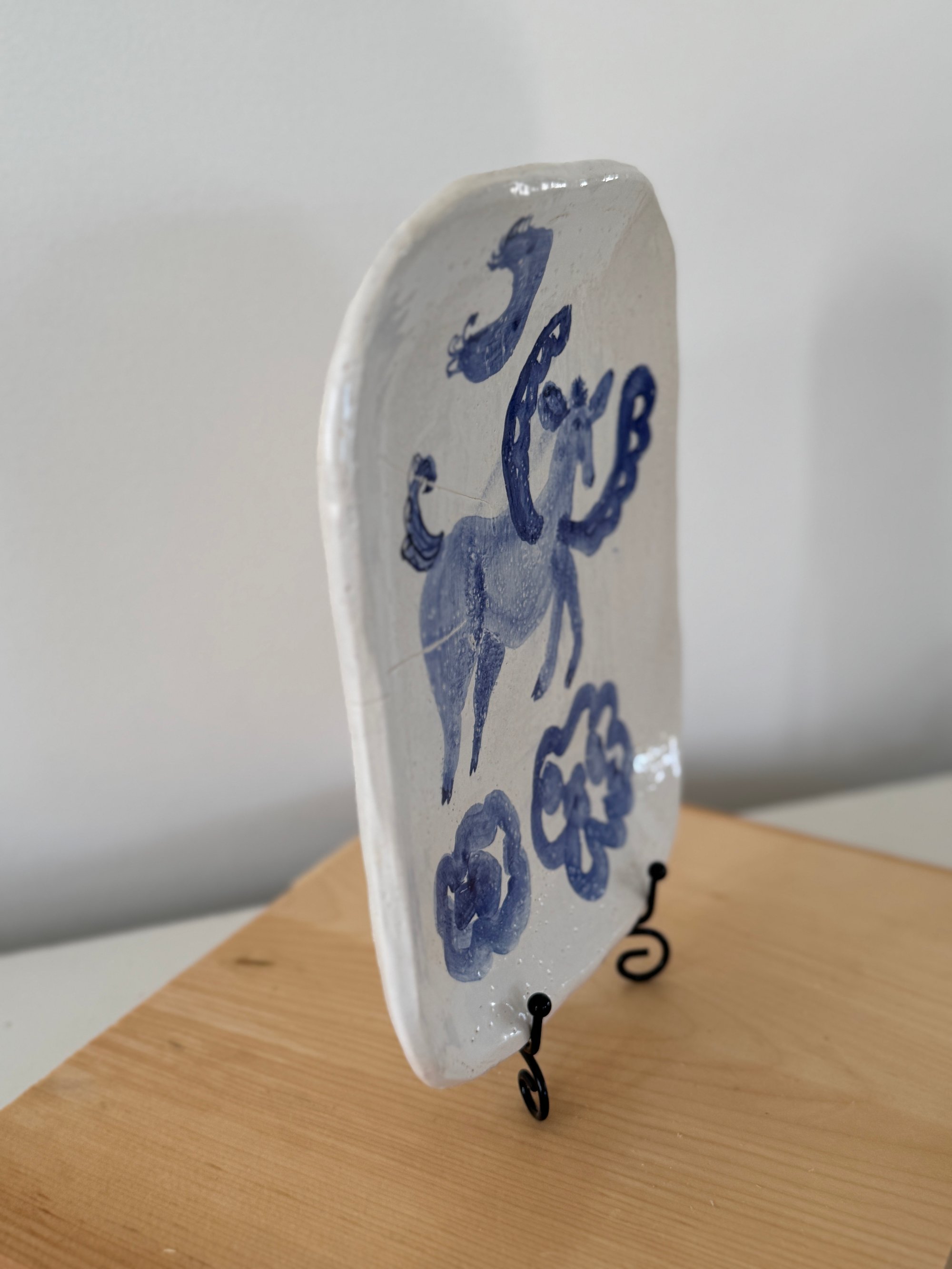 Fired with majolica glaze technique. Some elements from glaze firing are visible - specs. One of the plates [the flying goat] has a hairline crack, not all the way through, and i can't bear to toss it so have marked it accordingly.