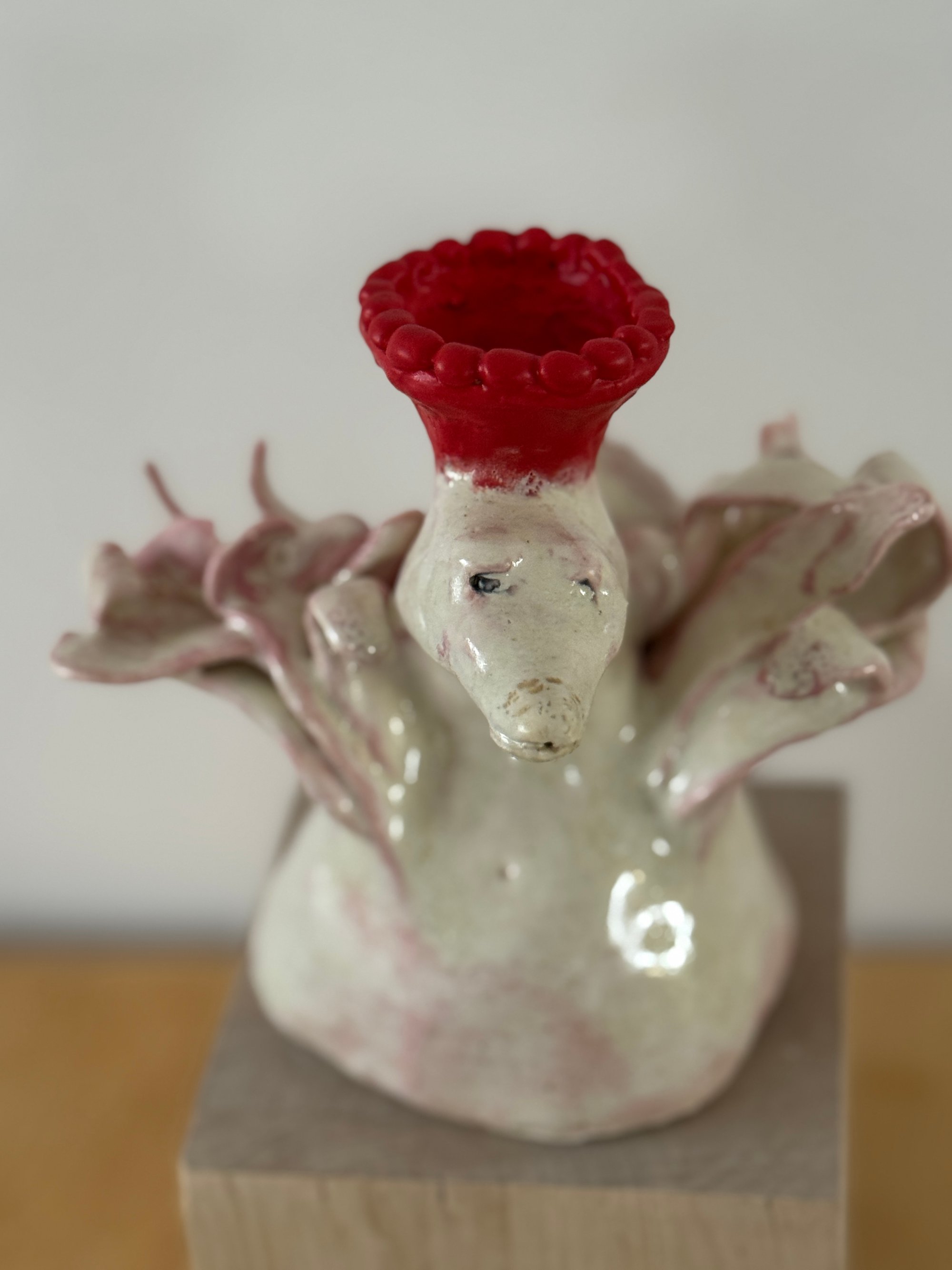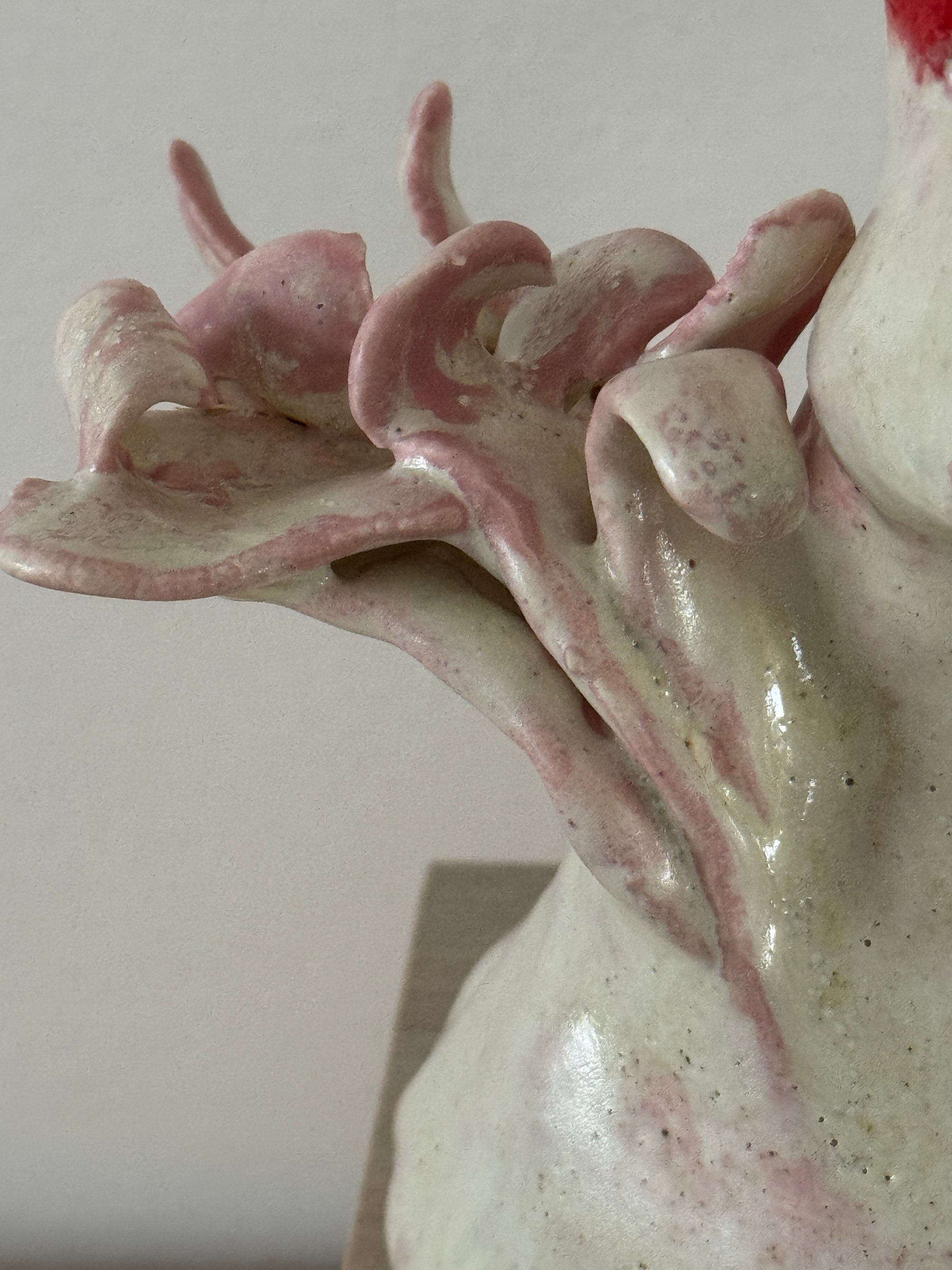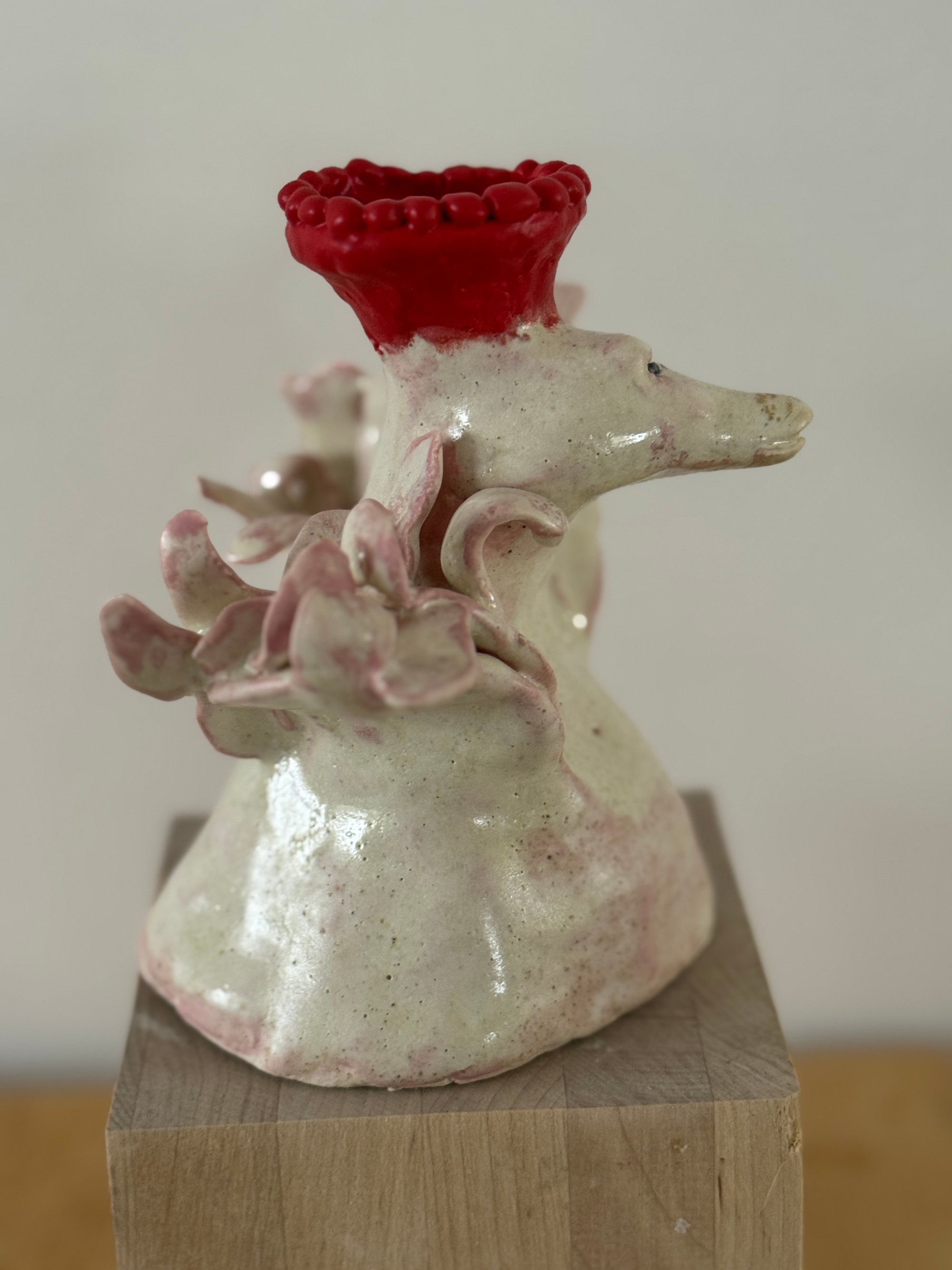 Beautiful creamy glaze over subtle tones of pink! The red crown adorns The Goose's head for his candle.