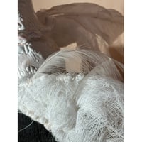 The fired clay body has wings of layered gauze, and two of The Goose's feathers. The glaze was applied to mimic the wavy, raggedy feathers of the Sebastapol breed.