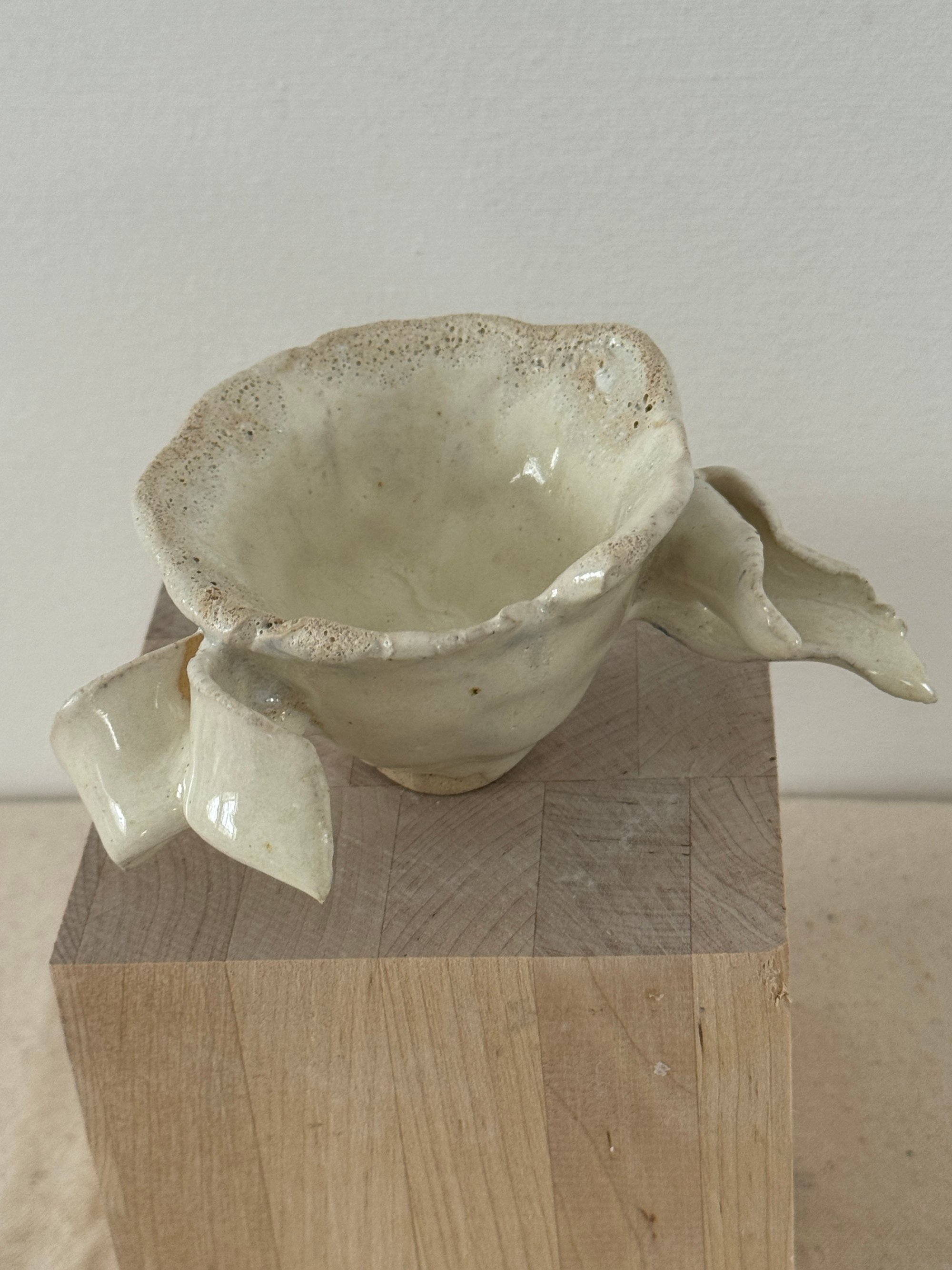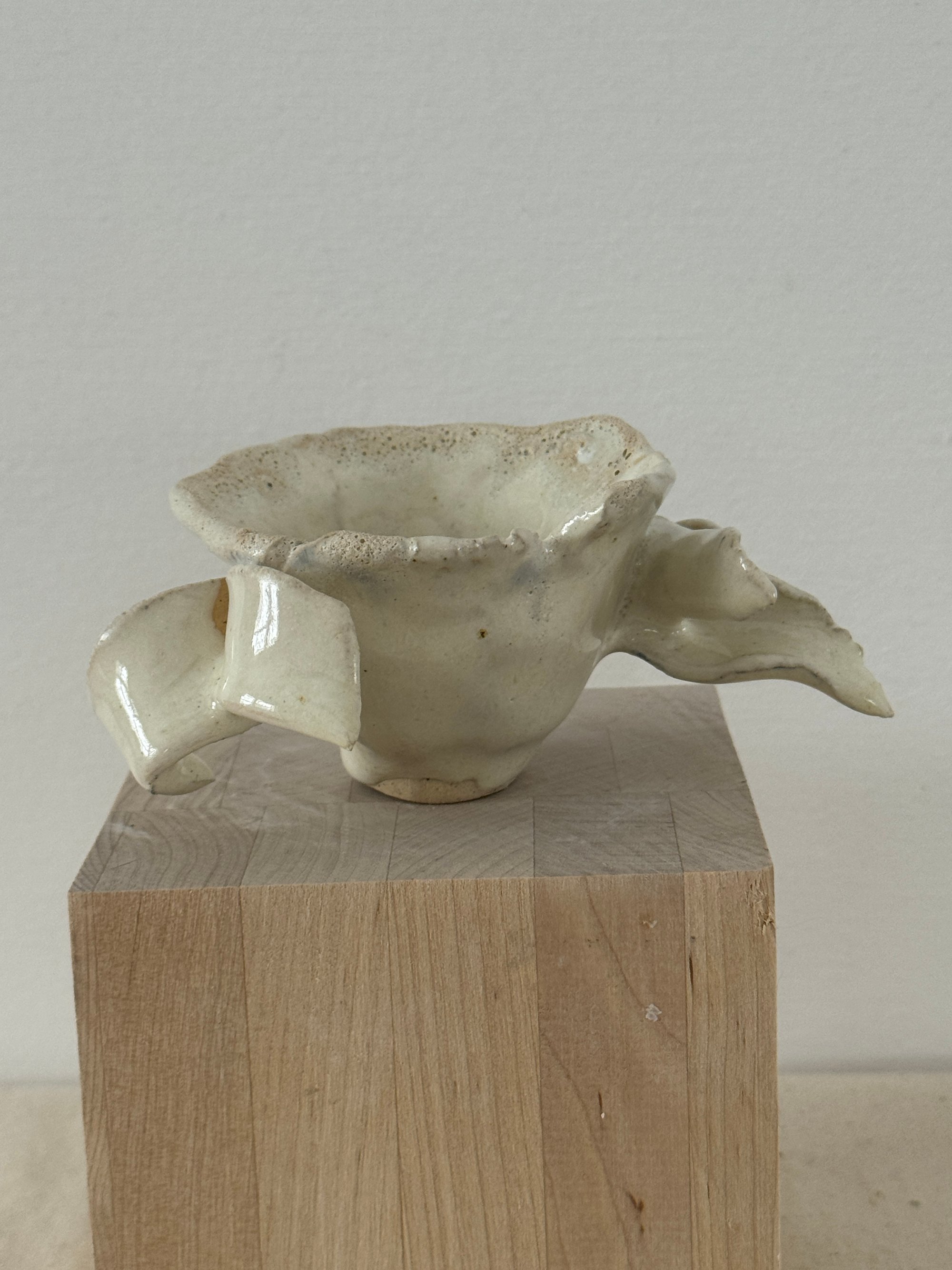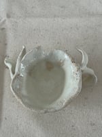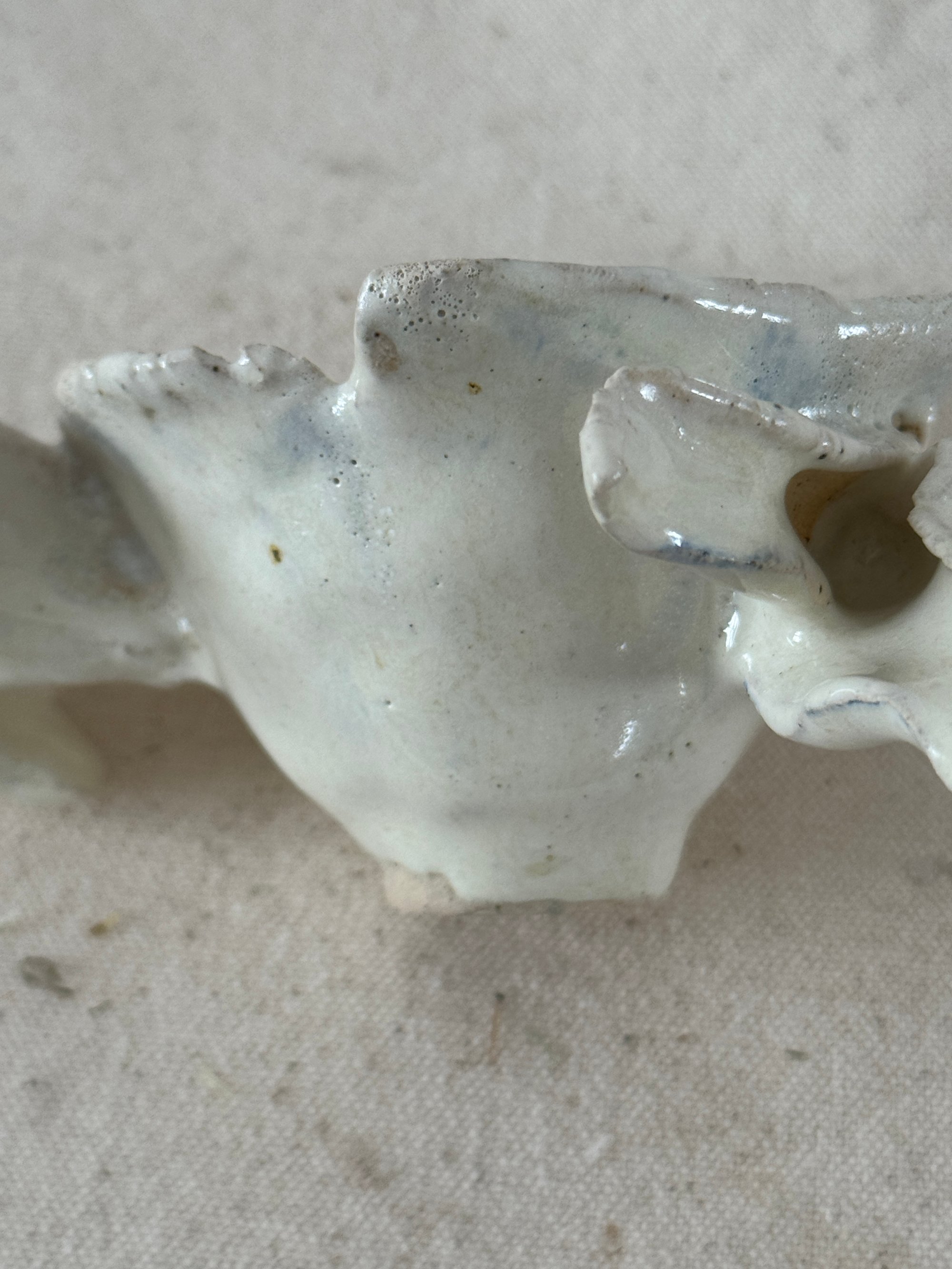 Stoneware with beautiful creamy white glaze, fit for an angel. 3" x 2" opening and 5" wing to wing. Small creatures have great powers even those that aren't deemed perfect in society.