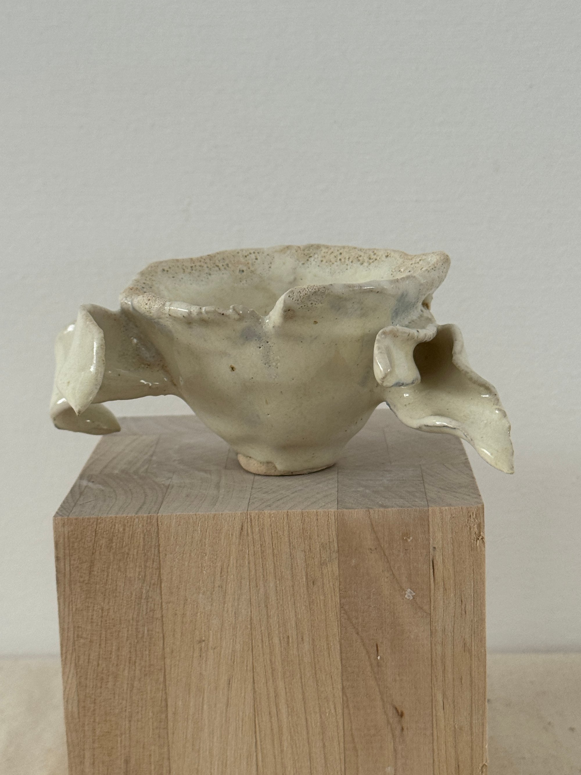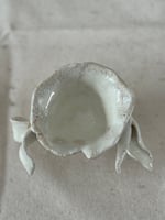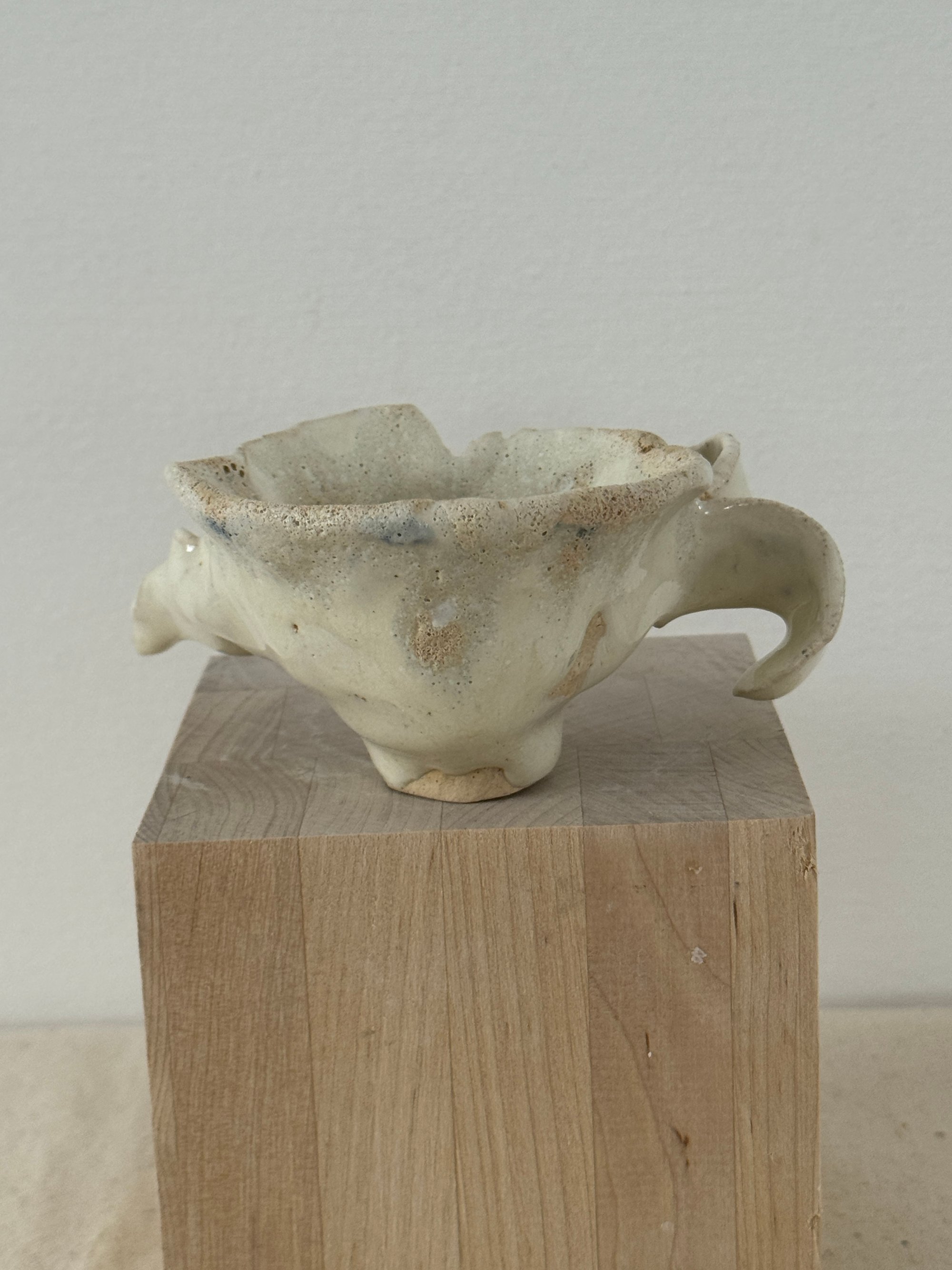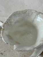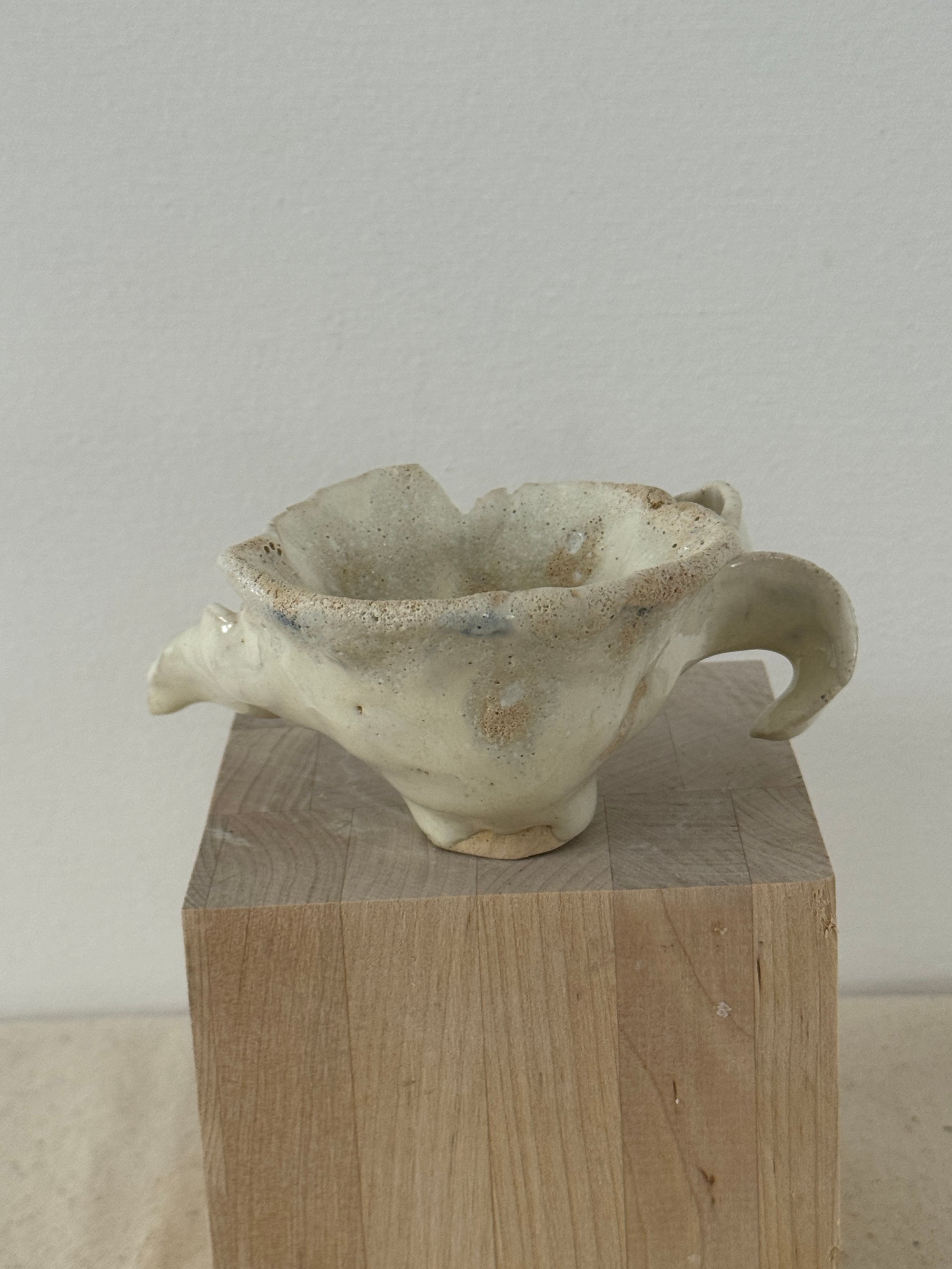 Stoneware with beautiful creamy white glaze, fit for an angel. 3" x 2" opening and 5" wing to wing. Small creatures have great powers even those that aren't deemed perfect in society.